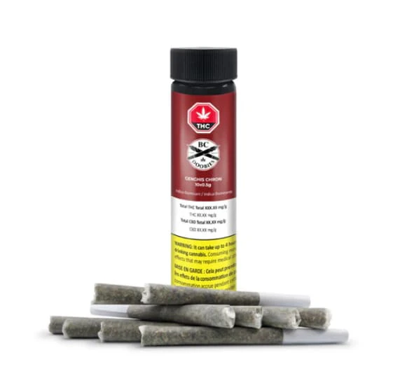 Conquer your next session with Genghis Chron. This bold and legendary cultivar forges its dynasty from the iconic Pre-’98 Bubba Kush and Sour Diesel, delivering a smoke worthy of an emperor. Drenched in crystalline trichomes, it boasts impressive potency while striking with a pungent aroma of kush and diesel. Terpenes include myrcene, limonene, and pinene. Genghis Chron’s medium-sized, frost-dusted nugs are milled and packed with precision into this 10-pack of joints.