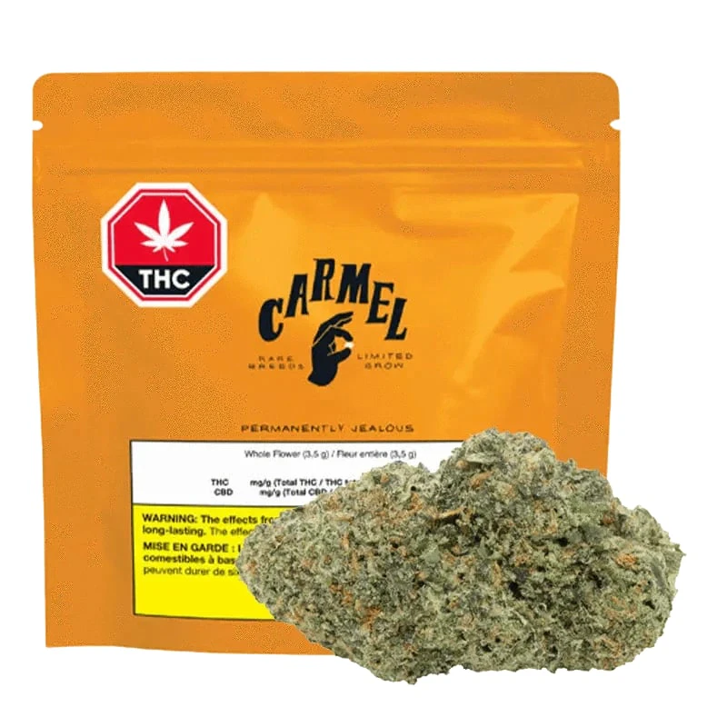 Available for limited time only. Permanently Jealous was created through a breeding collaboration between Carmel and Treez. Created by crossing Permanent Marker and Jealousy, Permanently Jealous delivers equal parts gas and funk, with just the right amount of citrus. Upon opening your pouch, expect dense, deep-green buds, with light marbling and bright orange hairs. Terpenes include limonene, caryophyllene, and farnesene.