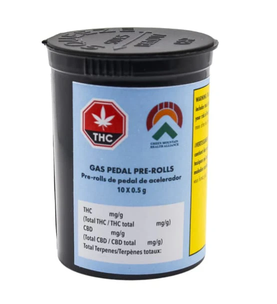 Discover Gas Pedal Pre-roll from Green Mountain Health Alliance—a meticulously crafted, limited-edition offering. This cultivar features dense, sticky buds with vibrant green hues, complemented by striking orange pistils and a glistening layer of trichomes. Each flower is hang-dried, hand/machine-trimmed, cured to perfection, and sorted for quality. Cultivated using mother nature's Sun and green house methods, Gas Pedal Pre-Rolls showcases a rich, earthy aroma with hints of citrus and spice, providing a unique olfactory experience. Embrace the distinct character of this heirloom and elevate your collection. Terpenes include limonene, beta-caryophyllene, and beta-myrcene.