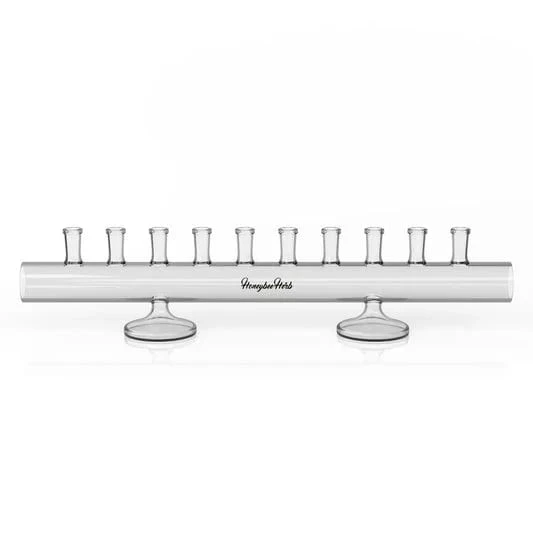 The Honeybee Herb 10 Piece Horizontal Banger Holder is a must-have accessory for keeping your dab station neat and organized. Designed to hold up to 10 male bangers of various styles, this clear glass holder offers a simple and elegant solution to prevent your bangers from being tossed around or damaged. With its horizontal design and two sturdy legs, this banger holder is both functional and stylish.