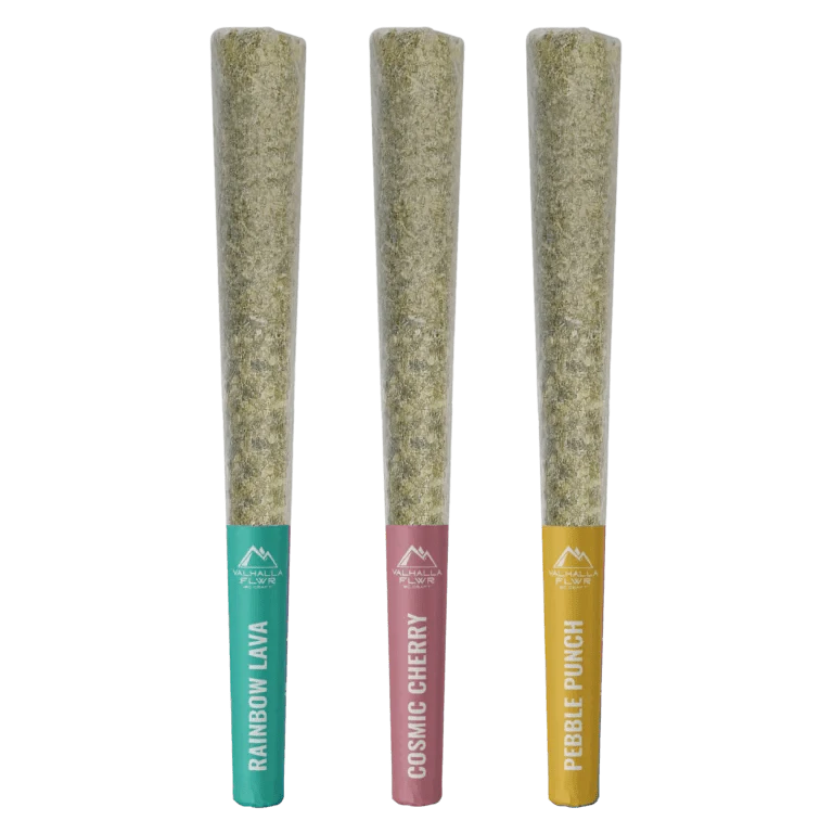 the Valhalla variety pack contains a half gram preroll of each of the legendary strains Rainbow Lava, Cosmic Cherry, and Pebble Punch.